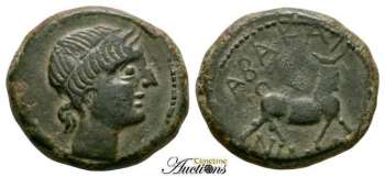 | Sear SG 1012 | Abakainon, Sicily. c343-336 BC. AE Hemilitron. Head of a nymph right, hair in sphendone / ABAKAI-NIN-ΩN, forepart of a butting bull left. SNG ANS 900; Calciati 3; BMC 11. | Text | Image |