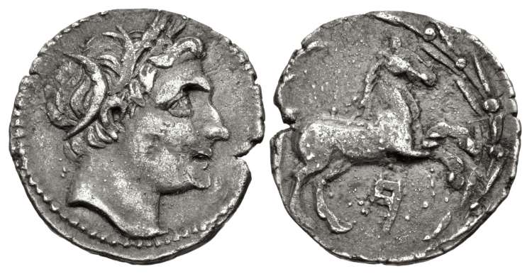 | Enna hoard 132-147 | Agrigentum, Sicily under Punic occupation, AR half shekel. 213-211 BC. 17.5 mm, 2.5 g. Head of Triptolemos right, wreathed with corn. / Free horse leaping right, Punic H below, all within wreath. Enna Hoard 132–147; Hoover HGC 172. | Text | Image |
