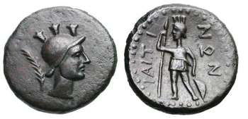 | HGC 504 | Sicily, Iaetia AE15. After ca. 241 BC. 3.25 g. Turreted and helmeted head of warrior (Roma?) right, palm branch behind head. / IAITINΩN, Turreted and helmeted warrior (Roma?) standing left, holding spear and resting left hand on shield at side. Hoover HGC 504; Calciati 4. | Text | Image |