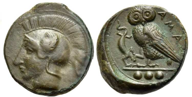 | Calciati 33 | Kamarina, Sicily, AE Tetras, Ca 420-410 BC. 15 mm, 3.43 gm. Head of Athena left, wearing crested Corinthian helmet decorated with wing / KAMA, owl standing left, grasping lizard; three dots (value mark) in exergue. SNG ANS 1229; Calciati III pg. 63, 33; SNG Copenhagen 169. | Text | Image |