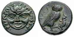 | Jenkins 186 | Sicily, Kamarina. C. 420-405 BC. AE Onkia 12mm, 1.35g. Head of Gorgoneion facing / KAMA, Owl standing right, head facing, holding lizard in talons; retrograde B in right field; one dot (value) below. Jenkins 186; CNS III, 13. | Text | Image |