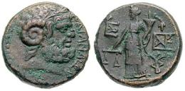 | Calciati 17 | Katane, Sicily. After 212 BC. AE 21mm. KATANAIΩN, laureate head of Zeus Ammon right / Dikaiosyne (Aequitas), standing left, holding scales and cornucopiae, monogram left, two monograms right. Calciati 17; BMC 82; SNG Cop 203. | Text | Image |