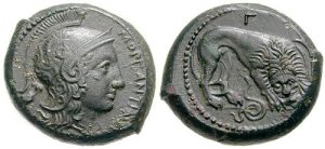 | Calciati 2 | Morgantina, Sicily. ca 340 BC. AE Dilitron. MOΡΓANINΩN, helmeted head of Athena right, in triple crested helmet decorated with serpent and spiral; owl behind / Lion right, tearing at stag's head; serpent below, Γ above. SNG Cop 474. | Text | Image |