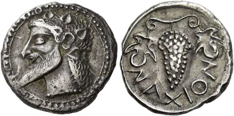 | Cahn 39 | Naxos, Chalcidian drachm circa 500, AR 5.68 g. Ivy-wreathed head of Dionysus left, with pointed beard and hair in form of dots, falling in waves over neck. / NAXION, Bunch of grapes hanging from stalk between two leaves. Kahn 39; Jameson 672. SNG ANS 514. SNG Lloyd 1147. | Text | Image |