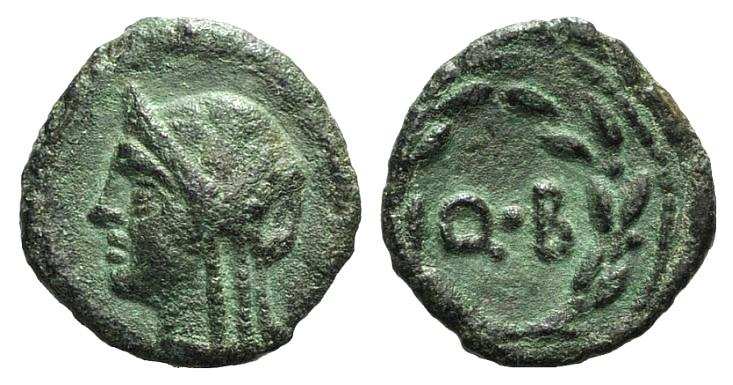| Calciati 91 | Probably Panormus, Sicily, late 2nd century BC. AE12, 1.20g. Veiled head of Ceres left. / Q dot B within wreath. Calciati I, 91 (Panormus); Hoover HGC 1703 (uncertain mint). | Text | Image |