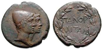 | Calciati 1 | Panormos, Sicily. After 241 BC. AE 18mm. Jugate heads of the Dioscuri right / ΠANOΡ-MITAN, legend in two lines within laurel wreath. BMC 21. | Text | Image |