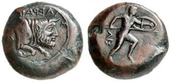 | Calciati 2 | The Sileraioi, Sicily. ca 357-336 BC. AE Litra. ΣIΛEΡAIΩN retrograde, forepart of a man-headed bull right / Naked Leukaspis charging right with spear and shield. Calciati 2; Hoover HGC 1243. | Text | Image |