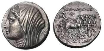 | SNGANS 889v | Sicily, Syracuse. Philistis, wife of Hieron II. 275-215 BC. AR 5 Litrae. ca 216-215 BC. Diademed & veiled head left; star to right / Nike driving quadriga right; K to right. Cf. Burnett 34.