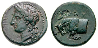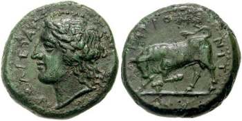 | Calciati 19 Sear SG 1241 | Sicily, Tauromenion. c 275-216 BC. AE 23mm. Diademed head of Herakles right / TAY-ΡROMENITAN, bull butting right. SNG ANS 1133, Calciati III 19/1, BMC 33, SNG Cop 934. | Text | Image |