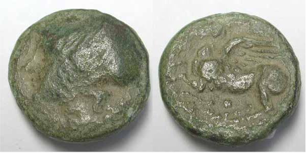 | Calciati 35 | Sicily, Tauromenion. After 212 BC. AE 24mm. Head of Athena right, in single-pendant earring, necklace & crested Corinthian helmet / TAYΡOMENITAN, Pegasos left. SNG ANS 1149, BMC 43, SNG Cop 942. | Text | Image |