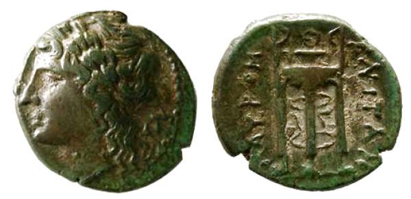 | Calciati 12 | Sicily, Tauromenion. After 336 BC. AE 15mm. Laureate head of Apollo left / Bunch of grapes. | Text | Image |