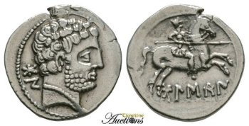Villaronga 211 | Bolskan, Spain AR Denarius. 150-100 BC. Bearded male head right, Iberian 'bon' behind head / Horseman galloping right holding with couched spear, Iberian 'bolskan' below. SNG BM Spain 710-732; Villaronga 211-216. | Text | Image |