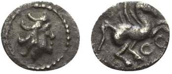 Burgos 1197 | Emporiai, Spain, AR Tetartemorion. After 241 BC. 7 mm, 0.13 g. Male head right with four tufts of hair sticking out at the back. / OO (or ΘO) beneath Pegasus flying right. Burgos 1197; CNH p. 60, 164. | Text | Image |