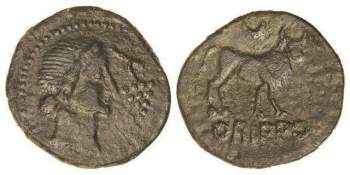 Burgos 1902 | Orippo, Spain. AE26. 1st C. BC. 6.77 g. Female head right; bunch of grapes before / ORIPPO beneath bull walking right, crescent above. CNH 5; SNG BM Spain 1627-1630; Burgos 1902. | Text | Image |