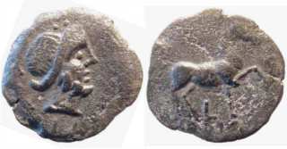 Sacili, Spain, AE27 Semis. 7.88 gr. SACILI, bearded head right / Horse pacing right, L and ola f below. Burgos (2008) 2020; Ripolles 524; Mionnet I, 187.