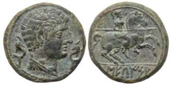 ACIP 1544 | Sekaisa, Spain. AE29, 20.68 g. early 1st early BC. Male head right, celtiberian SE (resembling ME) behind head, dolphin before / SEKAISA (in celtiberian) beneath horseman galloping right. holding palm branch. ACIP 1544; Burgos (1987), 691; SNG BM Spain 833-840. | Text | Image |