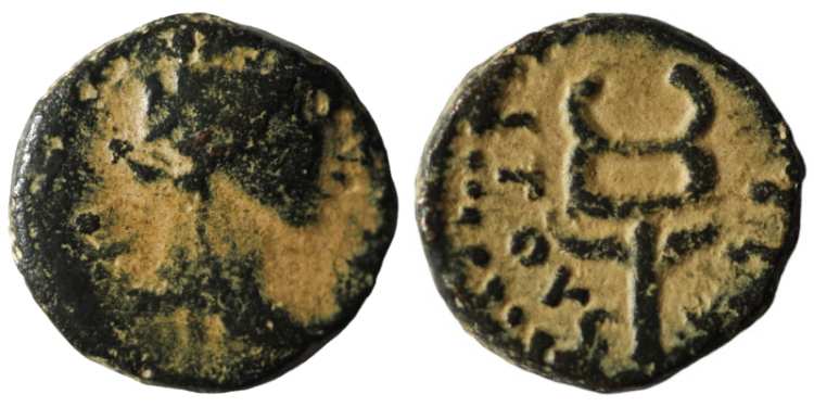 RPC 4250 | Augustus, AE28 of Antioch, Syria. Year 27, ca. 5-4 BC, 19.21 g. Laureate head right / AΡXIEΡATIKON ANTIOCEIΣ ZK in four lines within wreath of an archiereus. RPC 4250; BMC 167. | Text | Image |