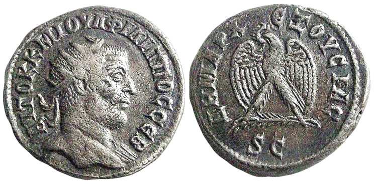 Prieur 701 | Volusian Billon Tetradrachm of Antioch, Syria. AVTOK K Γ AΦIN ΓAΛ OYENΔ OYOΛOYCCIANOC CEB, radiate, draped and cuirassed bust right / ΔHMAΡX EΞOYCIAC, eagle standing right, head turned left, S (officina) between legs, SC in ex. | Text | Image |