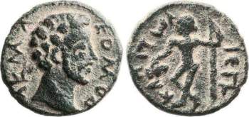 | Spij. 5 | Marcus Aurelius AE24 of Capitolias, Syria. AD 161-180. Dated local year 70, AD 167-168. 6.34 g. AYT KAIC M AYΡ ANTωNEINOC, laureate and cuirassed bust right. / KAΠITωΛIEωN I A A O, Astarte standing left, holding sceptre and cornucopiae. Spijkerman 5; Rosenberger 3; RPC IV temp 6556. | Text | Image |