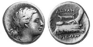 | BMC 1 Sear SG 2077 | Demetrias, Thessaly, AR hemidrachm. Ca 290 BC. Head of Artemis right, quiver over shoulder / ΔHMH-TΡIEΩN above and beneath prow right, IΣ monogram in left field. BMC 1; SNG Cop 48-49. | Text | Image |