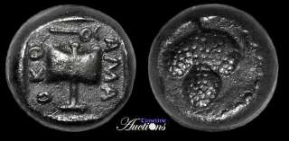 | Moushmov 5710 var | Amadokos II, king of Thrace. Maeonia mint. AE 20.66 mm, 16.28 gr, 359-451 BC. AM-A-TO-KO around bipennis / EΠI-KΛE-AN-ΔΡOΣ, vine with five bunches of grapes within linear square. Berlin 443/1909 var; Topalov 105 var; Moushmov 5710 var (all with different obv. legend configuration and a symbol). | Text | Image |