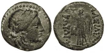 | SNG BMC 194 | Thracian kings, Kavaros, ca. 225-219 BC. AE, 5.94 gr. Kabyle mint. Laureate head of Apollo right / BAΣIΛEΩΣ KAYAΡOY, Nike standing left, holding wreath and palm. N-like monogram in left field. SNG BM 194. | Text | Image |