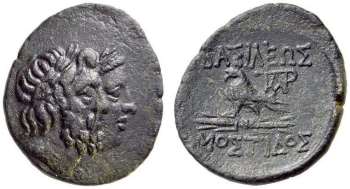 | Paunov 2B | Mostis, King of Thrace, ca 140-100 BC. AE21, 4.48 g. Laureate head of Apollo right / BAΣIΛEΩΣ MOΣTIΔOΣ above and beneath horse trotting left, right foreleg raised, no monogram, small rosebud or rosette in left field. Paunov, Type 2B (this coin illustrated); Helios 7, 224. | Text | Image |