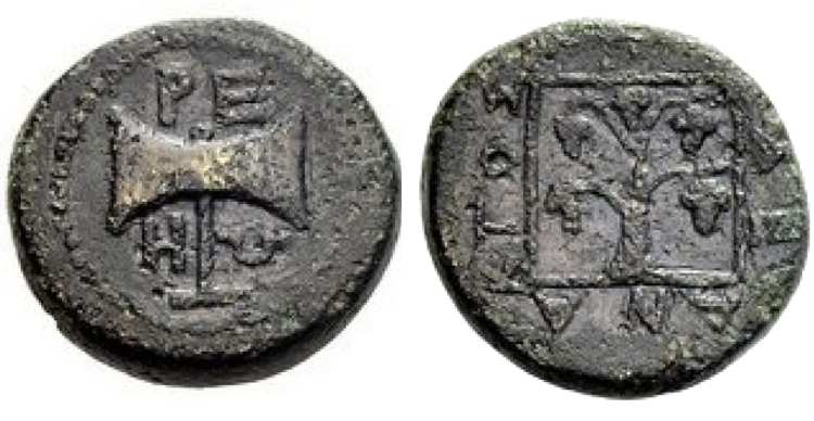 | Topalov 47 | Teres II or III, King of the Odrysians, Thrace. AE. Ca 350-347 BC. Magistrate Demokritos. T H Ρ E Ω around bipennis (double axe), the T formed by the handle. / EΠI ΔHM-OKΡ-ITO around grapevine with six bunches of grapes within linear square. Topalov Odrysians 47. | Text | Image |