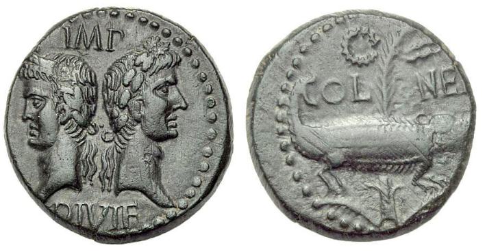 | RIC 159 Sear5 1731 | Agrippa & Augusutus AE Dupondius of Gaul, Nemausus. ca 10-14 AD. IMP DIVI F P-P, back-to-back heads of Agrippa, in rostral crown, & Augustus, laureate/ COL NEM, palm tree curving to left, crocodile right chained below, wreath to left of palm tip with long ties trailing to right. Cohen 8, RPC 525. | Text | Image |