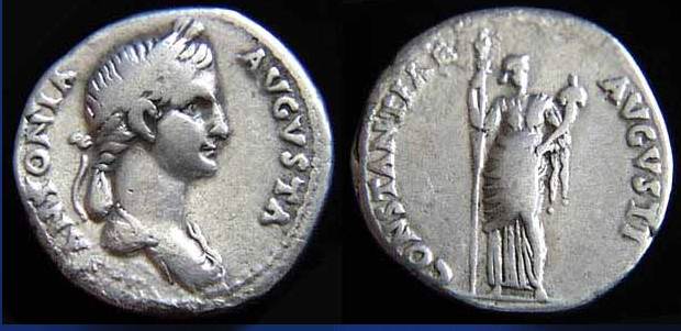 | RIC 66 Sear5 1900 | Antonia Denarius. ANTONIA AVGVSTA. laureate bust draped to right / CONSTANTIAE AVGVSTI, Antonia standing facing, draped as Constantia, holding long torch and cornucopiae. | Text | ![]() |
