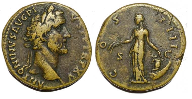 RIC 34v | Antoninus Pius Denarius. 139 AD. IMP T AEL CAES HADR ANTONINVS, draped bust right / AVG PIVS PM TR P COS II P P, Fortuna standing left, holding rudder on globe and cornucopiae. RSC 98b. | Text | ![]() |