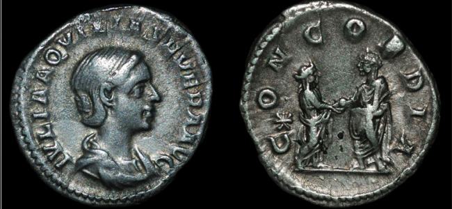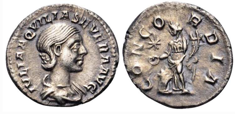 | RIC 226 Sear5 #7679 | Aquilia Severa AR Denarius. AD 221. IVLIA AQVILIA SEVERA AVG, draped bust right / CONCORDIA, Concordia standing left by altar, holding patera and double cornucopiae, star in upper right or left field. RIC 226; RSC 2; Sear 7679. | Text | Image |