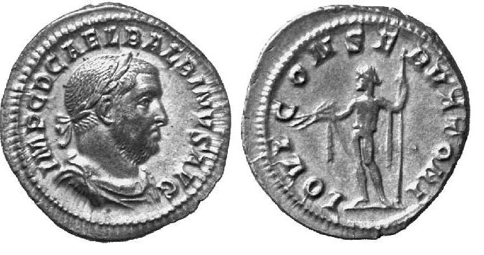 | RIC 7 Sear5 8490 | Balbinus denarius. IMP C D CAEL BALBINVS AVG, laureate, draped and cuirassed bust right / PROVIDENTIA DEORVM, Providentia standing left with wand over globe and cornucopiae. RIC 7, RSC 23. | Text | Image |