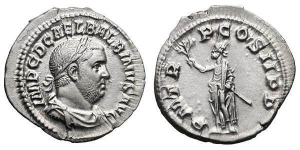 | RIC 4 | Balbinus, AR denarius, Rome. AD 238. 20mm, 3.37 g. IMP C D CAEL BALBINVS AVG, laureate, draped and cuirassed bust right / PAX PVBLICA, Pax seated left, holding branch and sceptre. RIC 4; Sear -; RSC 15. | Text | Image |