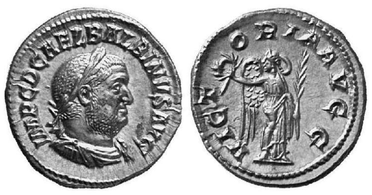 | RIC 8 Sear5 8491 | Balbinus Denarius. IMP C D CAEL BALBINVS AVG, laureate, draped, and cuirassed bust right / VICTOR-IA AVGG, Victory standing front with wreath and palm. RIC 8, RSC 27. | Text | Image |