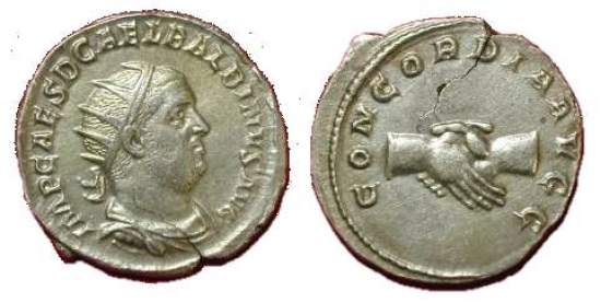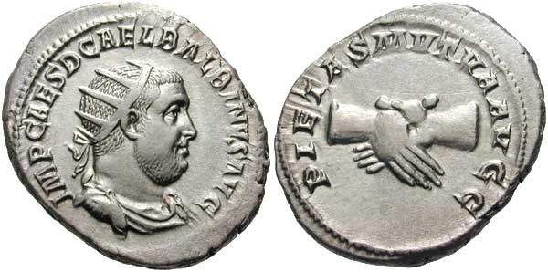 | RIC 12 Sear5 8486 | Balbinus AR Antoninianus. IMP CAES D CAEL BALBINVS AVG, radiate, draped and cuirassed bust right / PIETAS MVTVA AVGG, clasped hands. RSC 17. | Text | Image |