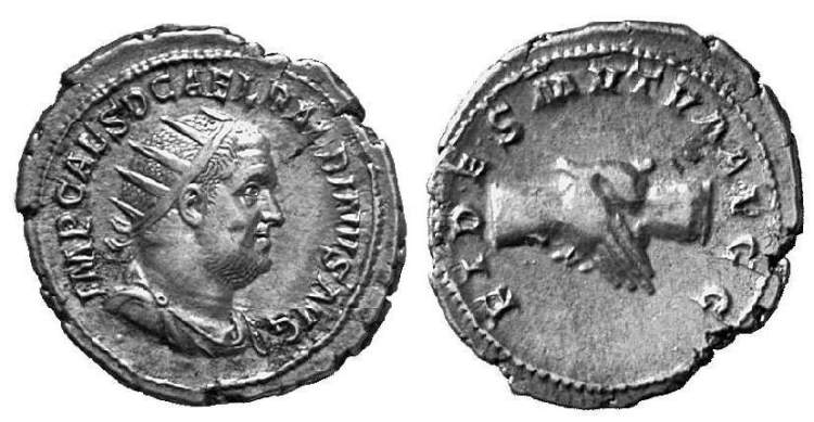 | RIC 11 Sear5 8485 | Balbinus AR Antoninius. IMP CAES D CAEL BALBINVS AVG, radiate draped bust right / FIDES MVTVA AVGG, clasped hands. RSC 6. | Text | Image |