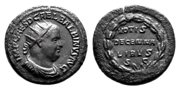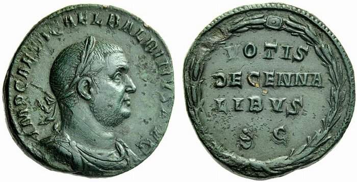 | RIC 20 | Balbinus AE sestertius, Rome. AD 238. 20.63 g. IMP CAES D CAEL BALBINVS AVG, laureate, draped and cuirassed bust right. / VOTIS-DECENNA-LIBVS-SC in four lines in wreath. RIC 20; Cohen 33; BMCRE 7. | Text | Image |