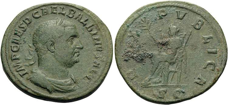 | RIC 24 | Balbinus AE sestertius, Rome. AD 238. 32 mm, 17.73 g. IMP CAES D CAEL BALBINVS AVG, laureate, draped and cuirassed bust right. / PAX PVBLICA around, SC below, Pax seated left, holding branch and sceptre. RIC 24; Cohen 16; BMCRE 25. | Text | Image |