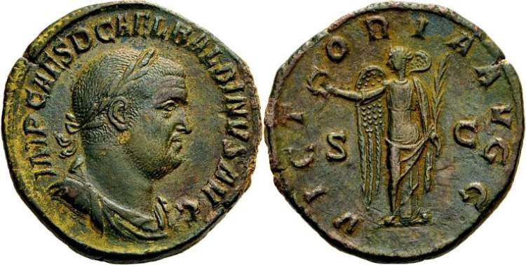 | RIC 25 Sear5 8500 | Balbinus AE Sestertius. IMP CAES D CAEL BALBINVS AVG, laureate, draped and cuirassed bust right / VICTORIA AVGG S C, Victory standing facing, head left, holding wreath and palm. | Text | Image |