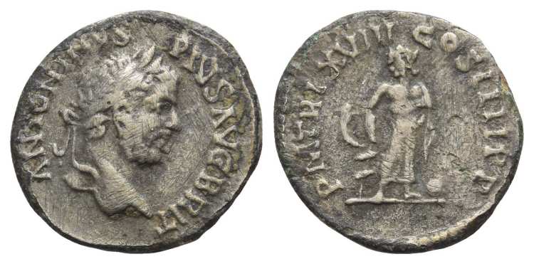 | RIC 42c | Caracalla Denarius. ANTONINVS AVGVSTVS, laureate, draped and cuirassed bust right / SAL GEN HVM, Salus standing half-left, holding serpent-wreathed sceptre and extending hand to kneeling figure. RSC 558a. | Text | Image | |