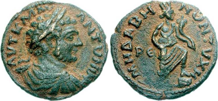 | Trajanopolis Moushmov 5038 | Caracalla, AE19 of Trajanopolis, Thrace. AVT K M AVR CE ANTΩNEINOC, radiate head right / TΡAIANOΠOΛEITΩN, Nemesis standing left, holding scales and short sceptre, wheel at foot. Moushmov 5038. | Text | Image | |