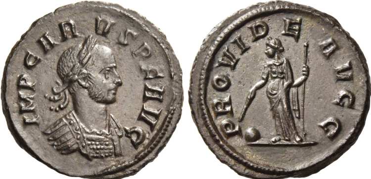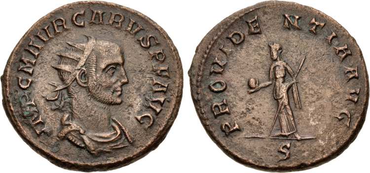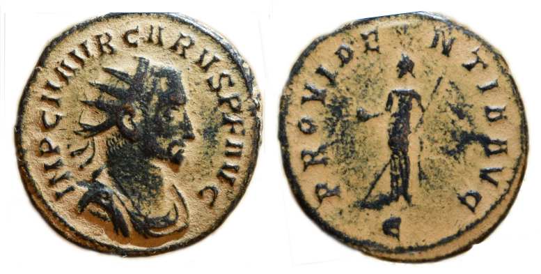 | RIC 43 | Carus, AE antoninianus, Rome mint. IMP CM AVR CARVS PF AVG, radiate, cuirassed bust right / PROVIDENTIA AVGG, Providentia standing left, globe at foot, holding baton and sceptre. No mintmark. RIC V-2, 43. | Text | Image |