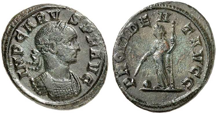 | RIC 75, P | Carus Antoninianus. Ticinum mint. IMP CARVS P F AVG, radiate, cuirassed bust right / PAX EXERCITI, Pax standing left holding standard and olive branch. Mintmark PXXI. Cohen 56. | Text | Image |