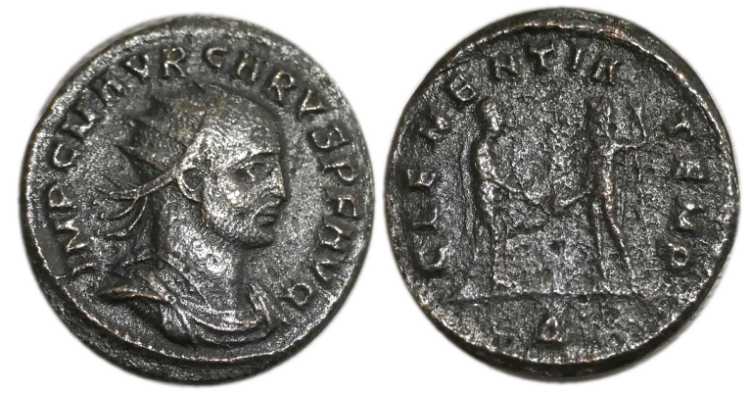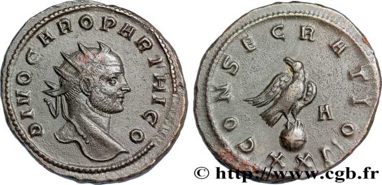 | RIC 125, Z | Carus AE Antoninianus. IMP CM AVR CARVS PF AVG, radiate, draped, cuirassed bust right / VIRTVS AVGGG, Carus standing right, receiving Victory from Jupiter, Carinus or Numerian, standing left. officina letter Z below. Mintmark XXI. Sear 12190. | Text | Image |