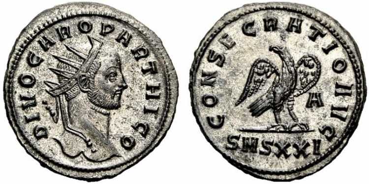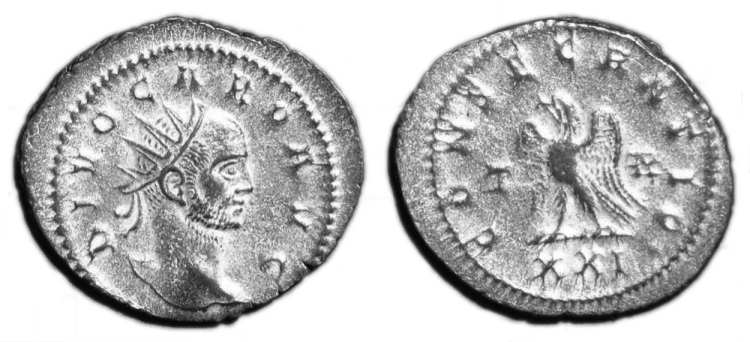 | RIC 129 | Carus, AR antoninianus, posthumous issue, after AD 284. Tripolis mint. DIVO CARO AVG, radiate head right. / CONSECRATIO, eagle standing left, head left, wings spread. T-R across fields. Mintmark XXI. RIC 129; Cohen-RSC 16. | Text | Image |