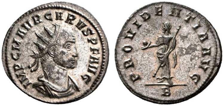 | RIC 119, E | Carus, AE antoninianus, Cyzicus mint. IMP CM AVR CARVS PF AVG, radiate, draped and cuirassed bust right. / PROVIDENTIA AVG, Providentia standing left, holding globe and transverse sceptre. Mintmark epsilon. RIC V-2, 119 var (unpublished mintmark). | Text | Image |
