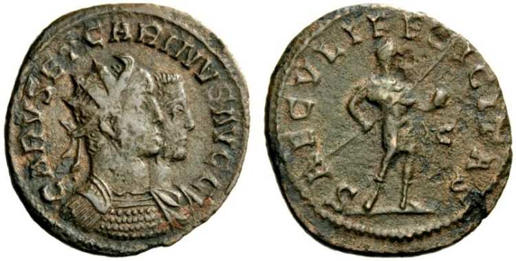 | RIC 25 | Carus, AE antoninianus, Lyons mint. VIRTVS CARI AVG, radiate, helmeted and cuirassed bust left, holding spear and shield / VICTORIA AVGG, Victory on globe between two captives, A in left field. RIC V-2, 25. | Text | Image |