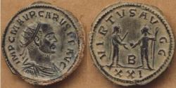 | RIC 125, Δ | Carus AE Antoninianus. IMP CM AVR CARVS PF AVG, radiate, draped, cuirassed bust right / VIRTVS AVGGG, Carus standing right, receiving Victory from Jupiter, Carinus or Numerian, standing left. officina letter Δ below. Mintmark XXI. Sear 12190. | Text | Image |