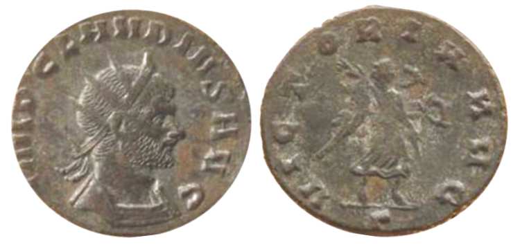 Normanby 929Claudius II, bi. antoninianus, Rome mint. IMP CLAVDIVS AVG, radiate, cuirassed bust right. / VICTORIA AVG, Victory running right, holding wreath and palm branch. Mintmark (officina) Γ. RIC 107 var (bust type); Normanby hoard 929; Cunetio hoard 2197; Chalgrove hoard II 416; Dalheim hoard 393; Oliver's Orchard hoard 617 etc.TextImage